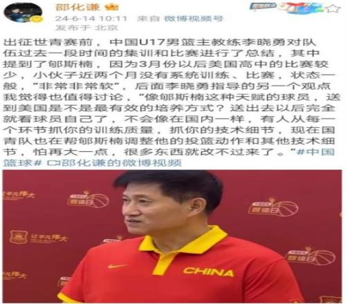 | 前国青男篮主教练李晓勇曾表示,郇思楠在美国没有专门的教练帮他练技术,与其如此还不如回到国内。