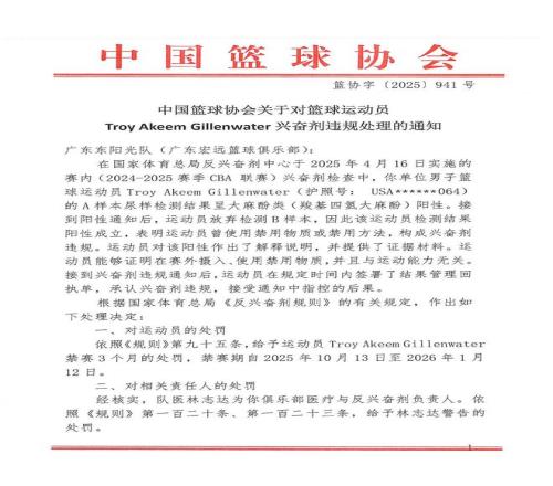 | 中国篮球协会13日宣布,对兴奋剂违规的中国男子篮球职业联赛(CBA)外援吉伦沃特处以禁赛3个月的处罚。 中国篮协在给广东东阳光队(广东宏远篮球俱乐部)下发的通知中说:“在国家体育总局反兴奋剂中心于2025年4月16日实施的赛内(2024-2025赛季CBA)兴奋剂检查中,你单位男子篮球运动员Troy Akeem Gillenwater(吉伦沃特)的A样本尿样检测结果呈大麻酚类(羧基四氢大麻酚)阳性。接到阳性通知后,运动员放弃检测B样本,因此该运动员检测结果阳性成立,表明运动员曾使用禁用物质或禁用方法,构成兴奋剂违规。运动员对该阳性作出了解释说明,并提供了证据材料。运动员能够证明在赛外摄入、使用禁用物质,并且与运动能力无关。接到兴奋剂违规通知后,运动员在规定时间内签署了结果管理回执单,承认兴奋剂违规,接受通知中指控的后果。” 根据国家体育总局《反兴奋剂规则》的有关规定,中国篮协对吉伦沃特做出了禁赛3个月的处罚,禁赛期自2025年10月13日至2026年1月12日。此外,广东东阳光队(广东宏远篮球俱乐部)作为管理单位受到了警告及负担20例兴奋剂检测费用(人民币36000元)的处罚,该单位的医疗与反兴奋剂负责人、队医林志达被给予警告处罚。 吉伦沃特,美国职业篮球运动员,在2024-2025赛季CBA常规赛中,吉伦沃特场均出战29.9分钟,场均贡献25.9分、7.3个篮板和2.0次助攻。 本文系观察者网独家稿件,未经授权,不得转载。 |