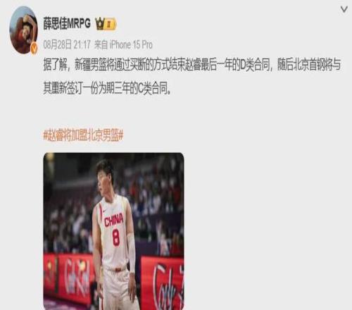今年夏天,赵睿与新疆队达成买断协议,以三年C类合同把天赋带到北京队,迎来职业生涯第二次转会。