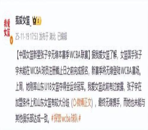 张子宇是中国女篮的内线新星,被宫鲁鸣寄予厚望,破格提拔她进入国家队,跟随球队征战亚洲杯,拿到了第三名。张子宇拥有2米26的身高,是内线不得多得的人才,只要能在篮下把球传到她手中,闭着眼都能把球搁进球。 前些日子,全运会上,张子宇就代表山东U18女篮,一路高歌,斩获了金牌,她自己更是投出了九成以上的命中率,简直就是巨大BUG。 之前有消息说,山东高速女篮正在和张子宇谈判,希望她能加入山东高速女篮,新赛季开始代表山东出战WCBA。可惜的是,根据我爱女篮的报道,张子宇与山东高速女篮的谈判未能达成一致,以至于张子宇错过了11月18日的球员注册日,使得张子宇将会无缘新赛季的WCBA联赛。