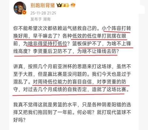 为此,“别跑刚背猪”连续向郭士强提出了4个问题,来质疑他的用人和战术:1、篮板球都保护不了,为什么不上有高度的锋线?众所周知,我们在身高上有优势,然而,郭士强却使用三后卫战术,结果,导致我们在关键时候连续丢掉篮板球,这也成为了中国男篮输球的关键原因。2、韩国队的李贤重,我们的后卫防不了,为什么不让锋线去防?本场比赛,李贤重表现太出色,投进了9记三分球,砍下了33分。显然,我们对他的防守,完全无用。然而,在这样的情况下,郭士强还用有身高劣势的后卫去防守他,显然,这让人完全是看不懂。
