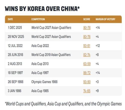 14分是近年来韩国队赢中国男篮的最大分差/图片来源:FIBA官网