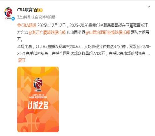 | 北京时间12月13日,CBA官方公布2025-26赛季揭幕战的收视情况,央视直播收视率创20-21赛季后近5年新高,全国观众人数超2700万,市场份额创近18年新高,而抖音直播总直播观看人次5001万。
