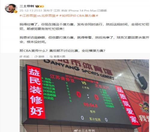 媒体人三土带刺老师更是毫不掩饰了—— 我得吐槽了,你现在搞这个潜力赛,发布会同时进行,然后这段时间,全场忙忙叨叨,都感觉要匆匆忙忙结束!我想采访庞峥麟,但他要打潜力赛,就得等着,然后完事了,球员又要回更衣室开会,根本没时间。那CBA宣传什么?赛后都不讨论比赛,全吐槽潜力赛?