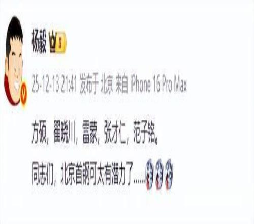 | 北京时间12月13日消息,2025-26赛季CBA常规赛第一轮全面开打,北京首钢男篮客场以84-74击败江苏男篮,拿到了赛季开门红。随后进行的潜力赛,北京男篮的首发,直接叫人惊呆了,首发5人加起来154岁,说好了锻炼年轻人呢?如此潜力赛,难怪又遭吐槽了,连名嘴杨毅都忍不住了:北京首钢太有潜力了。