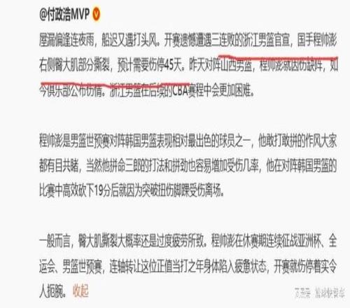 | 中国男篮目前确实是多事之秋,根据浙江队官方最新消息,男篮锋线大杀器程帅澎将因伤缺席45天。对于已经遭遇三连败的浙江队而言,这确实是一个晴天霹雳,程帅澎的受伤无疑让他们雪上加霜,彻底看不到希望了(CBA本赛季最倒霉球队)。而且,更为悲剧的是,目前距离男篮世预赛还剩下两个月,如果程帅澎真的伤停45天的话,他大概率是无法赶上男篮世预赛了。这对于中国男篮的打击还是非常大的,看样子,着急的除了丁伟,恐怕还有郭士强。