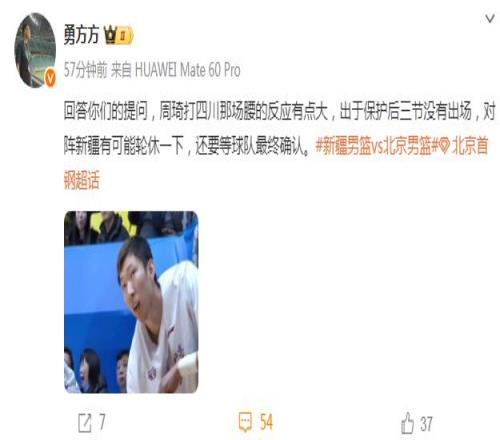 周琦在上一轮早早打卡下班,仅登场7分13秒高效得到9分2篮板1抢断,之后就因为全华班四川不堪一击,让周琦失去登场比赛的机会。 对此,媒体人勇方方如今表示:“回答你们的提问,周琦打四川那场腰的反应有点大,出于保护后三节没有出场,对阵新疆有可能轮休一下,还要等球队最终确认。”