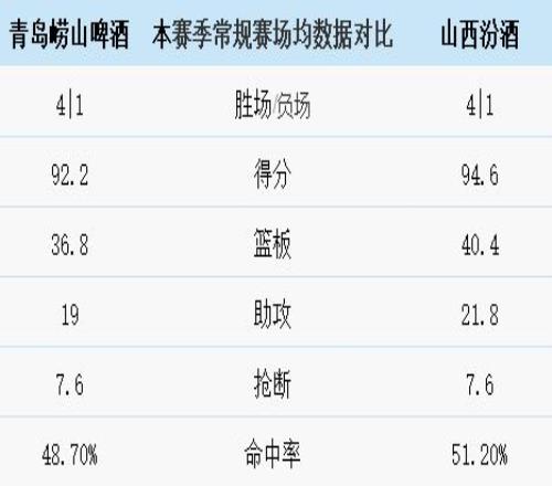 主要球员数据 青岛崂山啤酒 韦瑟斯庞:本赛季常规赛出战5场,场均上场20.8分钟,得到24.4分、4.2个篮板、5.8次助攻、1.0次抢断。 米奇:本赛季常规赛出战5场,场均上场27.6分钟,得到19.6分、8.4个篮板、1.4次助攻、1.2次抢断、1.4次盖帽。 王睿泽:本赛季常规赛出战5场,场均上场30.8分钟,得到10.2分、3.2个篮板、1.8次助攻。 山西汾酒 迪亚洛:本赛季常规赛出战5场,场均上场23.6分钟,得到18.0分、4.0个篮板、4.6次助攻、1.8次抢断和1.8次盖帽。 贾明儒:本赛季常规赛出战4场,场均上场25.3分钟,得到15.5分、3.3个篮板、3.5次助攻。 焦海龙:本赛季常规赛出战5场,场均上场27.8分钟,得到12.8分、4.8个篮板。 里程碑数据 约瑟夫·杨CBA生涯总得分6170分,位列CBA历史得分榜第40位,距离第39位的李根(6348分)还差178分。 王奕博CBA生涯助攻数1173次,位列CBA历史助攻榜第44位,距离第43位的林庭谦(1174次)还差1次。 约瑟夫·杨CBA生涯助攻数1148次,位列CBA历史助攻榜第48位,距离第47位的姜伟泽(1153次)还差5次。