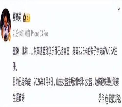 山东媒体:张子宇WCBA新赛季首秀确定1月4日主场对阵河北女篮