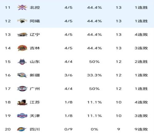 此外,昔日总冠军辽宁队遭遇一波4连败之后,排名跌至第十,此前一度高居第三位,上赛季常规赛第二的山西队,同样遭遇4连败,不过排名位列第七。