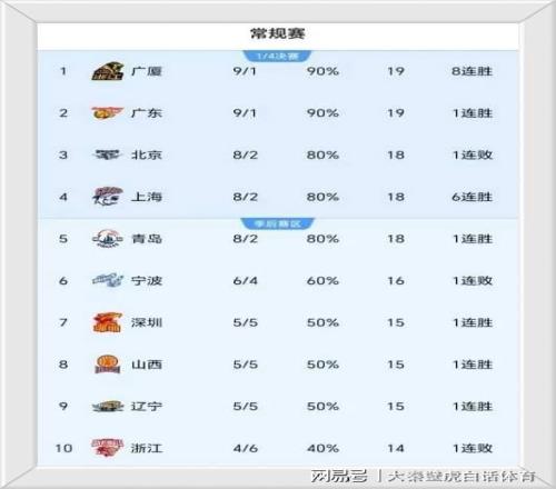 另外几场比赛,山东队客场107-94逆转同曦取得2连胜。 值得一提的是,山东队国手高诗岩终于找回手感,全场比赛11投8中,砍下25分,外加7个篮板和11次助攻,打出新赛季最高光的一次数据,也算报答了郭士强对自己的信任; 山西队主场91-77大胜江苏,重回前八,超级外援迪亚洛打出24+7+7断的全面数据; 广州108-106,加时送天津4连败,威金顿26+7+7,徐昕13+12,林庭谦30+6+6 最近积分排名如下: ①、广厦和广东同为9胜1负,排名积分榜前二; ②、北京队、上海队、青岛队同为8胜2负,排名3-5位,构成第二集团; ③、7-9名的深圳、山西、辽宁队,同为5胜5负,季后赛争夺激烈。 对于以上排名,大家怎么看?