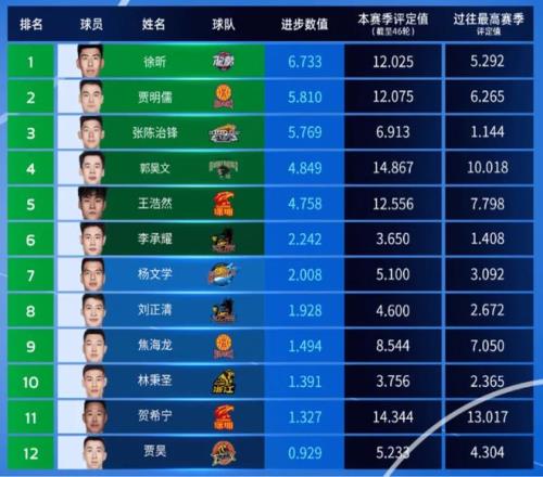 根据CBA公司公布的最新消息,广州队中锋徐昕,以进步数值6.733,高居第1-9轮最具进步球员第一位。山西队后场悍将贾明儒,以进步数值5.81,排在第二位。辽宁队中锋张陈治锋,以进步数值5.769,排在第三位。同曦队后场悍将郭昊文,以进步数值4.849,排在第四位。深圳队锋线悍将王浩然,以进步数值4.758,排在第五位。