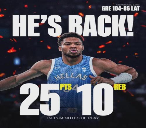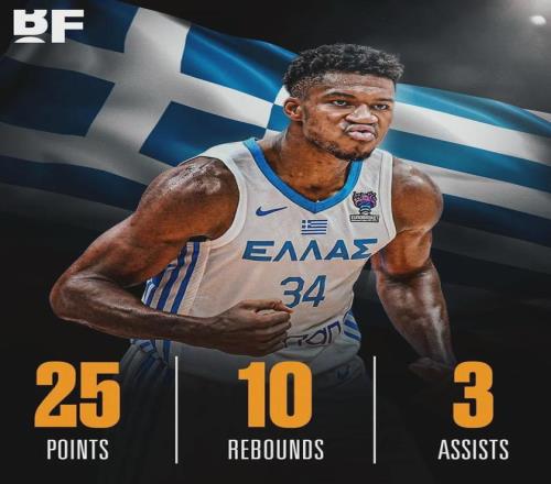 | 太强了,太强了。 字母哥今年国家队首秀,仅出战15分钟就投篮12中9,高效爆砍25分10板3助2断2帽,带领希腊104-86击败拉脱维亚。