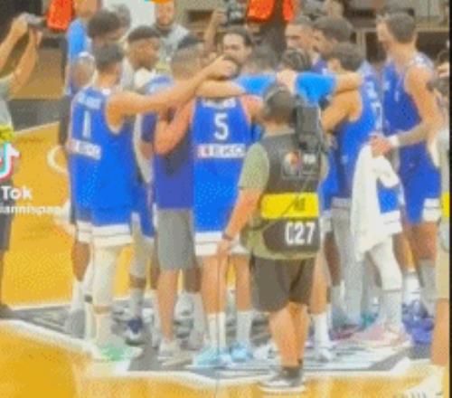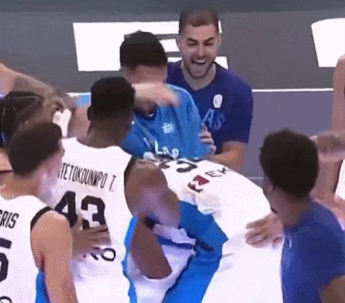 赛后,队友们用特殊仪式欢迎字母哥回归国家队。