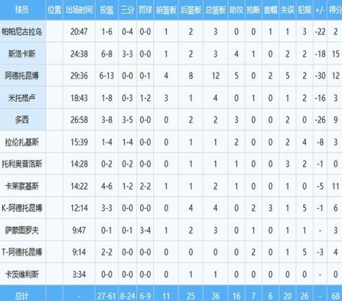但别看字母哥扣得那么无法无天,定睛一看约30分钟里投篮13中6仅得到12分外加12板5助2帽,正负值-30全场最低,当他表现失常时候,希腊的命运可想而知,最终68-94大比分不敌土耳其,无缘欧洲杯决赛。