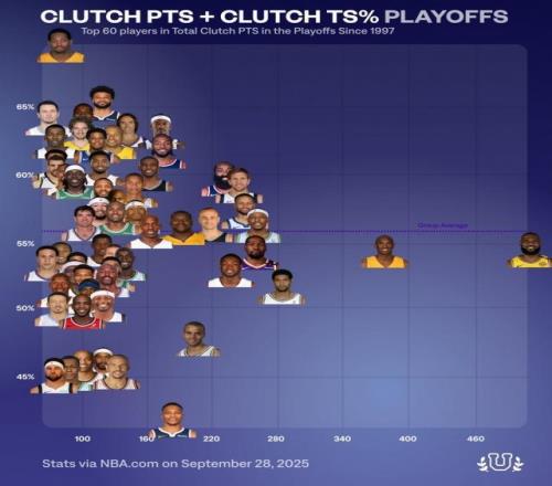直播吧9月29日讯 近日,数据媒体NBA University总结了自从1997年以来(NBA官网该项数据统计起始时间)在NBA季后赛中关键得分前60球员的真实命中率分布图表。 在该图表中,位置越靠上代表得分效率越高;位置越靠右代表得分总量越高。詹姆斯的季后赛关键得分遥遥领先,效率略低于入围球员的平均真实命中率;罗伯特-霍里的季后赛关键得分真实命中率高居第一,但得分总量仅在入围线附近。 |