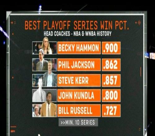美媒晒WNBA与NBA季后赛胜率前五主教练:贝基哈蒙居首