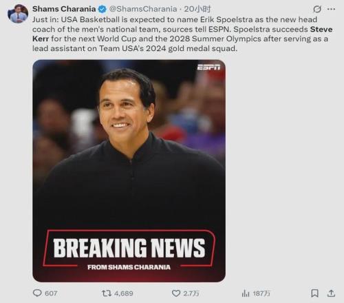 | 北京时间10月11日,据NBA名记Shams报道,斯波尔斯特拉接替科尔,成为美国男篮新一任主教练,率队征战2027年篮球世界杯和2028年洛杉矶奥运会。科尔在2021年成为美国男篮主帅,率队出战了2023年世界杯和2024年奥运会。