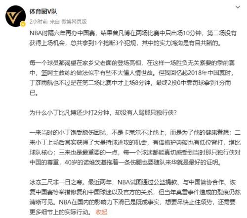 | 雷速体育10月13日讯 今日,知名媒体人@体育圈V队谈到了昨日曾凡博在NBA中国赛次站未能上场的问题。 观点如下: NBA时隔六年再办中国赛,结果曾凡博在两场比赛中只出场10分钟,第二场没有获得上场机会,总共拿到1个抢断3个犯规,其中的实力鸿沟是有目共睹的。 每一个球员都渴望在家乡父老面前登场亮相,在这样一场胜负无关紧要的季前赛中,篮网主教练的做法似乎有些不大懂人情世故。但我回忆起2018年中国赛时,丁彦雨航也不过是在第二场比赛中才上场8分钟,最终2投0中靠罚球拿到1分而已。 为什么小丁比凡博还少打2分钟,却没有人骂那支独行侠? 一来当时的小丁饱受膝伤困扰,不是卡莱尔不让他上,而是为了他的健康着想;二来小丁上场后其实获得了大量持球进攻的机会,有借掩护突破也有低位背打,堪比球队核心;三来也是最重要的一点,每一个球迷都能真切感受到当时那只独行侠对中国的尊重,40岁的诺维茨基拖着一条伤腿也要随队来华就是最好的证明。 冰冻三尺非一日之寒。最近两年,NBA试图通过公益捐款、与中国篮协合作、恢复中国赛等举措修复和中国球迷以及官方的关系,但当年莫雷事件造成的裂痕仍然清晰可见。NBA在国内的影响力下滑已是既成事实,想要尽快止住颓势,还需要更多细节上的实际行动。 |