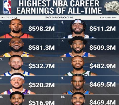 | 10月20日,根据美国薪资网站Spotrac数据,刚刚和火箭完成提前续约的杜兰特,职业生涯总薪水达到5.982亿美元,超越詹姆斯成为历史第一人!
