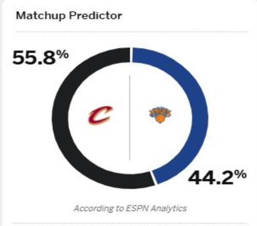 东部头部之争!ESPN预测骑士有55.8%的概率击败尼克斯