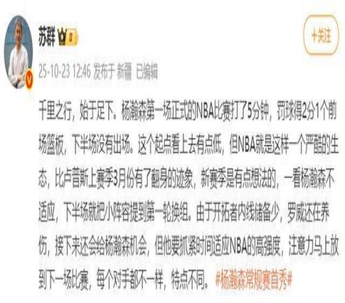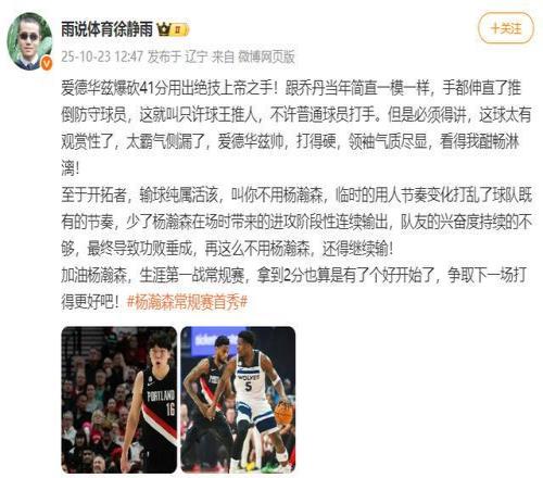 NBA常规赛首秀贡献2分1篮板,杨瀚森回应被麦克丹尼尔斯隔扣,称利拉德对自己倾囊相授