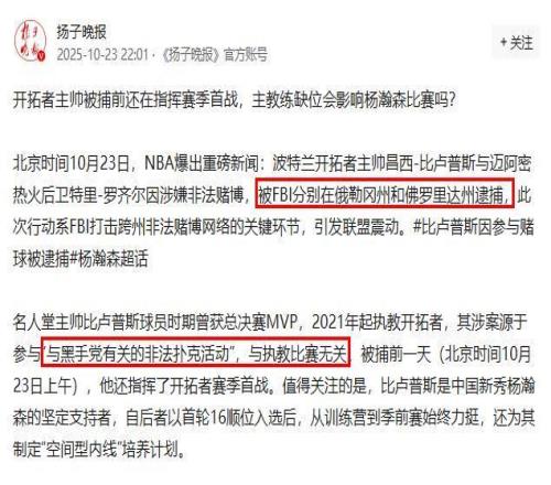 文| 拾言札记 编辑 | 拾言札记 声明:本文内容均是根据权威资料,结合个人观点撰写的原创内容,文中已标注文献来源及截图 前言 开拓者新赛季首秀刚落下帷幕,上午球员们还在球馆里为输给森林狼懊恼,晚上就传来了炸锅的消息——主教练比卢普斯被FBI带走了。 前一天还在赛场边指挥战术、赛后为杨瀚森解释出场时间的教练,转眼成了阶下囚。