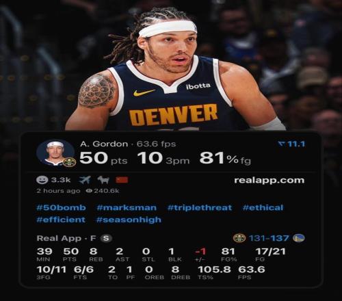 | 就在亚历山大拿到NBA新赛季第一个50+后不到2小时,赛季第二个单场得分50+的表演到来,这位球员打出的数据定格在50分8篮板2助攻,运动战21投17中,三分11中10,罚球6中6。看向如此恐怖的三分准头,你可能下意识猜测打出这一数据的人是库里,但正确答案是:阿隆·戈登。 北京时间10月24日,掘金迎来赛季揭幕战,他们客场挑战金州勇士。经历了一个加时赛的苦战,戈登拿到了创职业生涯纪录的50分(此前最高41分),他在三分线外的准星令人惊叹,上半场就7投7中,追平了NBA历史半场三分全中的命中纪录。最终全场打完,戈登的真实命中率为105.8%,超越凯瑞·欧文,成为了NBA历史单场真实命中率最高的50分先生。