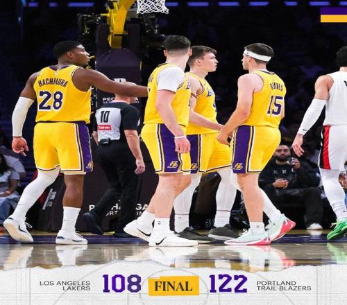 夏普单打得分,格兰特2罚全中,范德比尔特暴扣还以颜色。霍勒迪单打布朗尼得分,开拓者挑战判罚成功,克内克特2罚全中。霍勒迪、夏普与里夫斯各有冲击篮下打进,克内克特中投得分,阿夫迪亚2罚全中,紫金军团请求暂停。里夫斯命中续命远投,波特兰请求暂停。卡马拉空切上篮得分,克林根空接打进,开拓者领先14分得以锁定胜局。比赛仅剩74秒,杨瀚森被替换上场,里斯与克内克特对射远投,时间走完。最终,开拓者以122比108完胜湖人。 两队数据 开拓者队,阿夫迪亚17中8,三分球8中5狂砍25分4板4助3帽、霍勒迪15中10,三分球7中4独得24分5板6助2帽,末节连续得分成为取胜功臣。格兰特13中7得到22分3板3助3断、克林根12中8贡献16分14板2助2帽、夏普16中6,三分球6中0得到了16分7板2助4断、乐福5分4板1助、卡马拉4分4板3助、韦斯利4分1板3助、里斯3分、穆雷2分5板2断、吕佩尔1板。 湖人完败开拓者