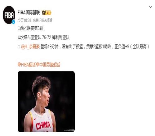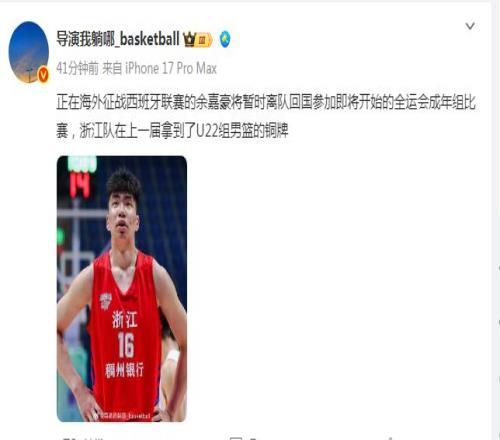 余嘉豪在连续5轮首发后,留洋生涯首次沦为替补,进攻端完全没有获得出手机会,也是留洋首次0分,无疑在球队的地位并不稳固。 如今根据媒体人导演我躺哪_basketball报道:“正在海外征战西班牙联赛的余嘉豪将暂时离队回国参加即将开始的全运会成年组比赛,浙江队在上一届拿到U22组男篮的铜牌。” 余嘉豪尚且处在争夺球队首发位置的时刻,但却被召回参加全运会比赛,无疑将让他在队内的处境更加艰难。 |