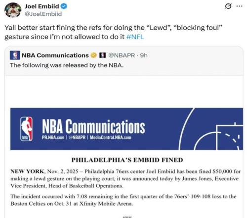 结果恩比德依旧不服,直接转发NBA的处罚报告,正面回怼道:“你们最好对裁判做出的那种下流阻挡犯规动作做出处罚,毕竟我没有被允许做这一动作。” 恩比德所提及的裁判“阻挡犯规”动作为双手叉腰,虎口置于髋部两侧,与恩比德做出的下流动作的确有些类似,但暗指的意义明显不同。