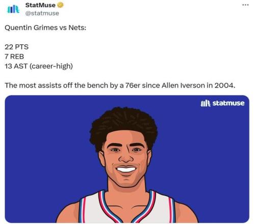 奇兵生涯之夜 在后场双核发威的同时,奇兵格莱姆斯也持续蜕变,13中7拿下22分7篮板13助攻1抢断1盖帽。 不仅交出+32全场最高正负值,还送出13次助攻展现多面手风采,其中单场13次助攻创造格莱姆斯生涯新高。 凭借这样的表现,格莱姆斯成为04年艾弗森后,76人队史首位以替补身份做到这点的球员。