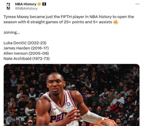 马克西破纪录 好在恩比德的缺阵与被罚闹剧丝毫没有影响到76人队,球队反而在恩比德缺席后强势反弹拿下一场大胜,一扫前一场1分憾负的阴霾。 其中马克西轻松拿下26+6+7数据,开季前6场连续送出至少25+5助表现,成为NBA历史上第5位交出这一壮举的球员,前四人分别是东契奇(22-23)、哈登(16-17)、艾弗森(05-06)和阿奇博尔德(72-73)。
