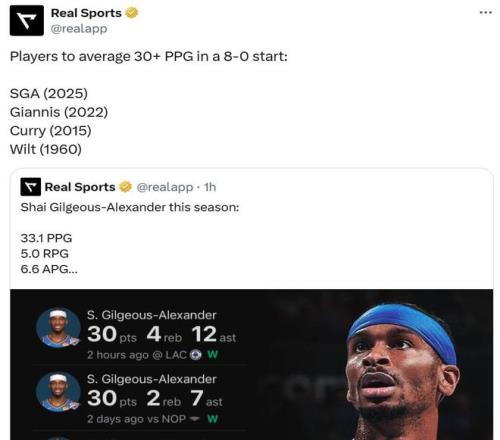 同时本场是亚历山大连续第80场拿到20+得分,超越大O独占历史第三,仅次于张伯伦的92场和126场。 这也是开季至今亚历山大傲人表现的缩影,新赛季至今亚历山大场均交出33.1分5板6.6助1断1.4帽,成为张伯伦(60-61)、库里(15-16)和字母哥(22-23)后第四位率队开季拿下8连胜同时场均交出30+得分表现的球员。