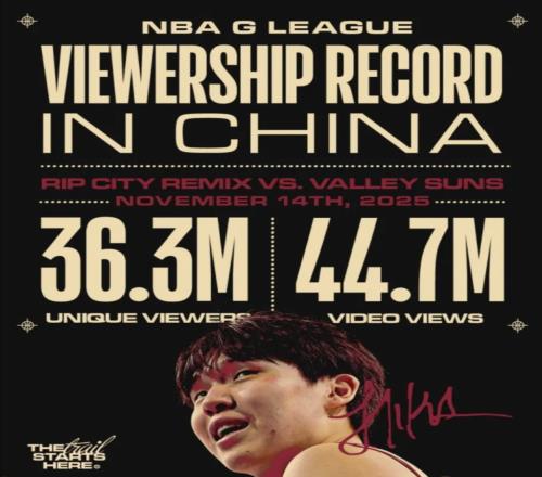 波特兰开拓者队携手自己在NBA发展联盟的下属球队撕裂之城混音队进行了官宣,表示杨瀚森在11月15日参加的混音队跟山谷太阳队的比赛,创下了该联赛在中国大陆地区的收视纪录。 据统计,这一场NBA发展联盟的比赛合计吸引了3630万名独立观众,意思就是去重之后的观赛人数,而比赛的视频的总观看次数更是达到了4470万。 不得不说,杨瀚森的比赛吸引力还是很强,有很多的人会对杨瀚森表达各种各样的态度,但是都忍不住想要看杨瀚森出场打比赛。事实上,那一场比赛并不是杨瀚森打得最好的比赛,当时混音队以107比104逆转击败太阳队,杨瀚森在29分钟内贡献8分13篮板4助攻1抢断1封盖。 而在后面一场比赛里,杨瀚森面对南湾湖人队拿到了21分9篮板3助攻1抢断3封盖,在比赛最后关头命中了2个绝命三分球,差点帮助球队获胜。