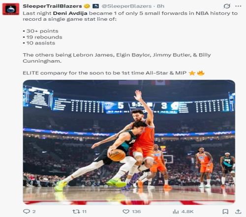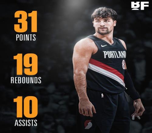 4.阿夫迪亚是开拓者队史首位两次30+15+10三双的球员;