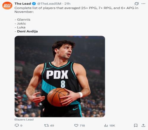 5.本赛季只有扬尼斯、约基奇、东契奇、阿夫迪亚场均达成25+7+6; 6.单场23个罚球是本赛季第二多; 7.前20场拿到500+100+100,队史比肩滑翔机、利拉德;