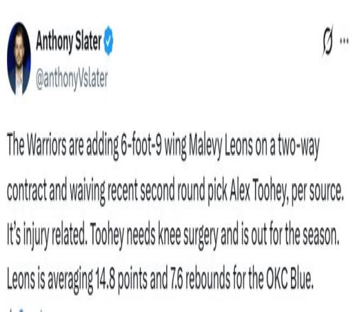 | 北京时间12月9日,勇士队记Slater报道,消息人士透露,勇士队将签下身高2米06的侧翼球员马莱维-莱昂斯,合同为双向合同,同时裁掉今年的52号秀亚历克斯-图希。据悉,裁员与伤病有关,图希需要接受膝盖手术,赛季报销。莱昂斯目前效力于G联赛的俄克拉荷马城蓝队,场均贡献14.8分和7.6篮板。