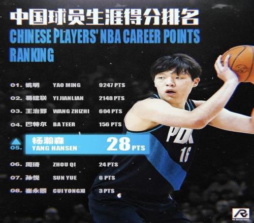 中国球员NBA得分榜:杨瀚森又上升一位有机会追上易建联
