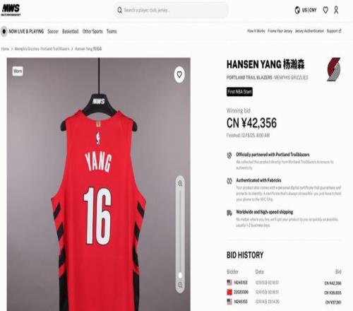 | 北京时间12月16日,杨瀚森在12月8日开拓者对阵灰熊的比赛中穿着的球衣在拍卖网站上成交。