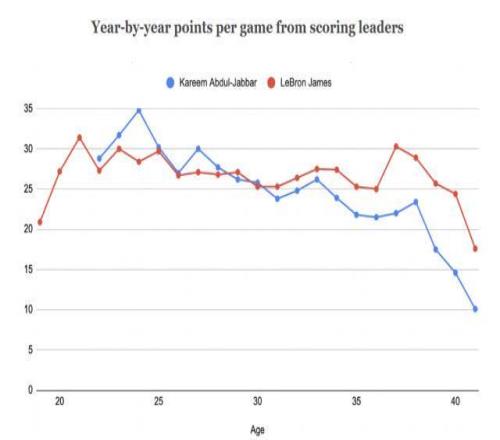 | 詹姆斯是NBA历史上独一无二的球员。这位生涯总得分王再次创下纪录,成为联盟首位征战23个赛季的球员。 然而,2025-26赛季的詹姆斯,也与过往任何版本的自己都截然不同。坐骨神经痛迫使他职业生涯首次缺席揭幕战。在缺阵洛杉矶湖人队的前14场比赛后,他展现出了前所未有的状态起伏与比赛风格变化。 距离他的41岁生日仅剩10天,他看起来终于像个凡人了。在这支湖人队中,他正更清晰地退居到队友东契奇和里夫斯之后。 生涯得分王的得分下降 对于NBA历史上几乎所有其他球员来说,能打到40岁本身就是一项非凡的成就。场均得到17.6分更是前所未有。此前在这个年龄的得分领先者是贾巴尔,他在41岁赛季场均得到10.1分,那是在漫长、渐进的衰老曲线末端。他最后一个场均至少24分的赛季是在33岁。 相比之下,詹姆斯在新秀赛季之后,连续20个赛季场均至少得到25分,上赛季也只是略微下滑至24.4分。