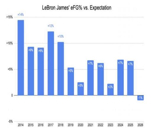 詹姆斯场均得分下降6.8分,是上赛季所有47位场均至少20分的球员中跌幅最大的。(与此同时,里夫斯场均得分增加7.6分,是上赛季所有20分得分手中涨幅最大的。) 这种下滑很大程度上源于詹姆斯历史级别稳定性的衰退。本赛季他有3场比赛得分至少20分,但他也有过13分、11分、10分和8分的比赛。最广为人知的是,那场8分的比赛终结了他连续1297场常规赛得分上双的纪录。 一般来说,NBA中的产出是效率和产量共同作用的结果,而詹姆斯得分下降是这两方面都出现问题的结果。GeniusIQ根据投篮距离和防守人位置等因素,追踪了NBA每位球员的预期有效投篮命中率。而在追踪时代(自2013-14赛季起)至今的每一个赛季,詹姆斯的实际有效投篮命中率都超过了预期值。 然而在2025-26赛季,詹姆斯有记录以来首次略微低于其投篮质量预期的效率值。