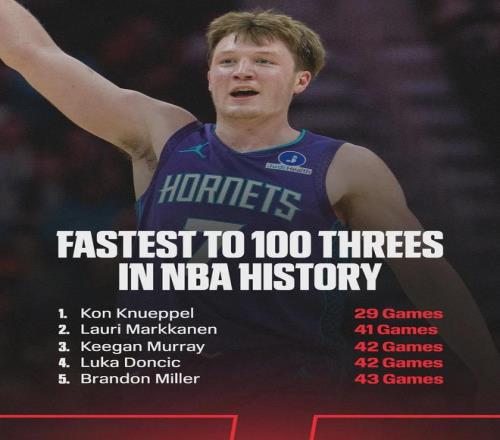 | 北京时间12月23日,NBA常规赛,黄蜂132-139不敌骑士。黄蜂4号秀克尼佩尔出战30分49秒,11投6中,三分9中5,罚球3中3,拿到20分1板2助。克尼佩尔生涯三分总数来到104记,仅用29场比赛投进100+三分,NBA历史最快。