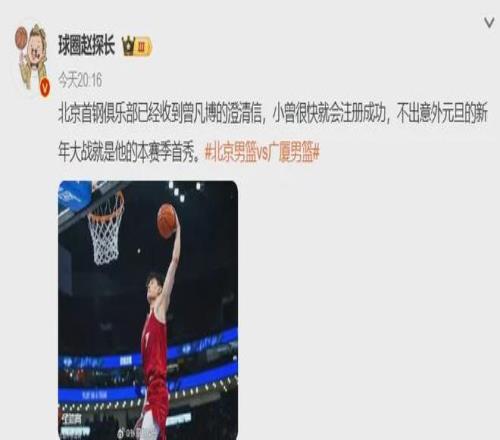 | 欢迎归来。 国内知名媒体人报道:北京队已经收到曾凡博的澄清信,即将注册完毕。