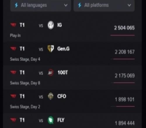 电竞新闻10月24日讯 外媒统计S15全球总决赛至今海外峰值前五的比赛均有T1,具体如下: 1-T1对阵IG:250万。 2-T1对阵GEN:221万。 3-T1对阵100T:218万。 4-T1对阵CFO:190万。 5-T1对阵FLY:189万。 值得一提的是,T1目前只在S15全球总决赛上进行过五场比赛,占据海外峰值前五。 |