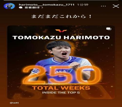 累计250周排名世界前五,张本智和:现在才刚刚开始呢!