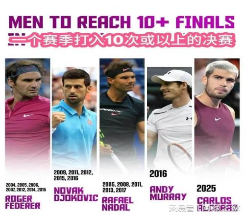 盘点本世纪球员表现,共有5位男选手在一个赛季打进10+决赛。除了阿卡外,其余四人不是他人,正是费纳德穆四巨头。
