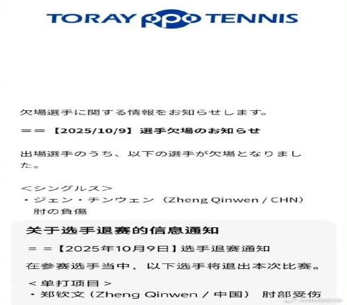 | 据央视新闻10月9日报道,据官方消息,赛事卫冕冠军郑钦文因肘部受伤退出WTA500东京站。此前,郑钦文已经因伤退出了武汉赛和宁波赛。