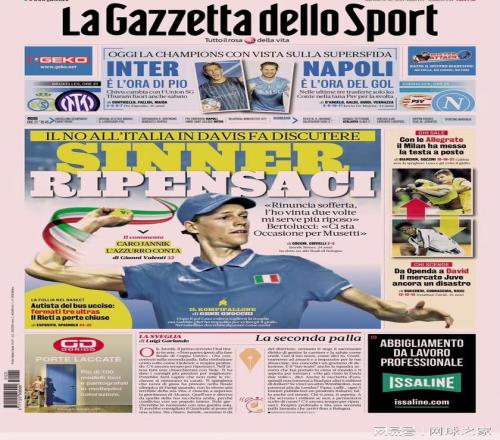 | 意大利网坛巨星辛纳近日陷入一场远超网球本身的风波。因决定不参加即将到来的戴维斯杯赛事,这位24岁的球星遭到了专注保护消费者权益与公民权益的非政府组织CODACONS的猛烈抨击,该组织要求撤销授予他的所有官方荣誉,包括体育外交大使任命、体育功绩金项链乃至都灵市荣誉市民称号。