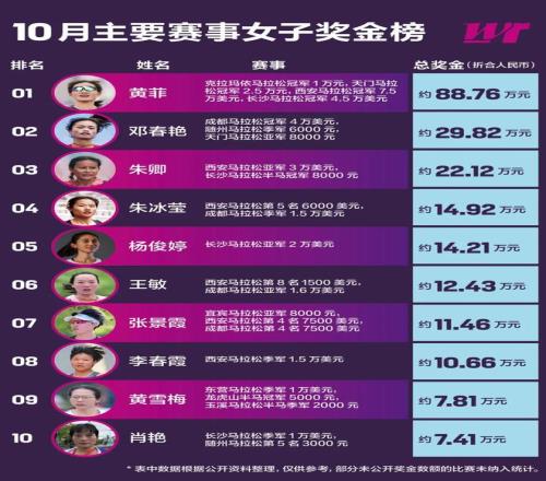 当然,在周末扎堆的比赛中,幸运的不只是黄菲,拿到今年成都马拉松女子冠军的邓春艳,继天门马拉松后继续PB,也顺势带走4万美元奖金,成为10月奖金榜第二名。 有关这场奖金争夺战还将持续到11月的杭州马拉松的赛道。届时,10万美元(达到指定成绩后为12万)的冠军奖金花落谁家?